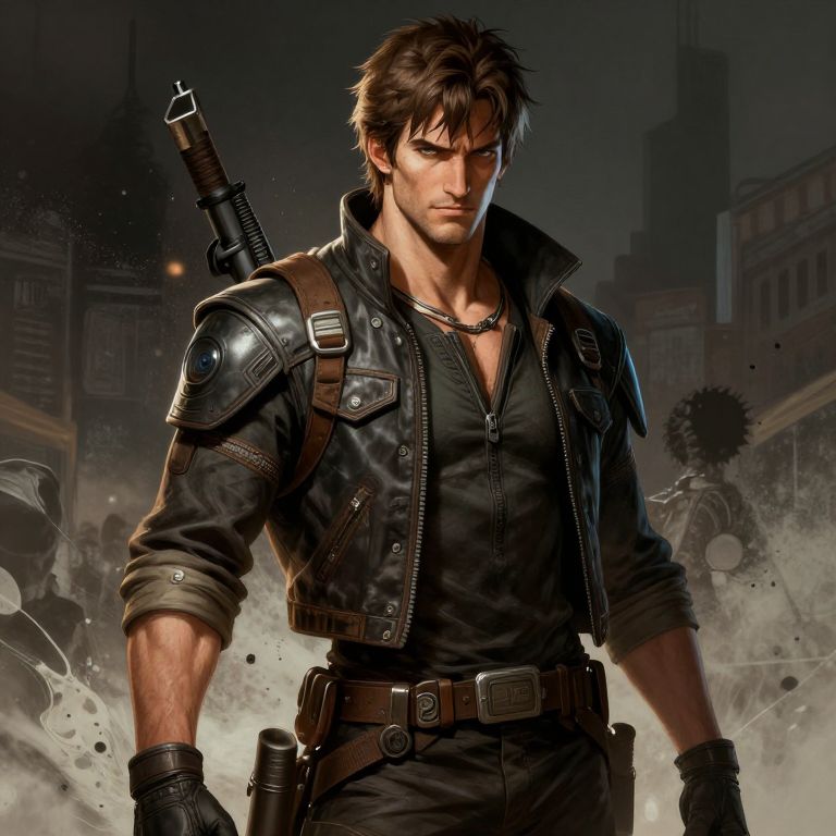 This digital artwork features a muscular, handsome man with short, dark brown hair and intense blue eyes. He wears a black leather jacket with shiny, armored shoulder pads, and a black shirt that's partially unbuttoned, revealing a necklace. A sheathed sword is strapped to his back. His black pants are held by a brown belt, and he wears black gloves. The background is a dark, urban scene with blurred, illuminated buildings and a misty, smoky atmosphere. The man's determined expression and the detailed textures of his clothing and background create a gritty, action-packed vibe.