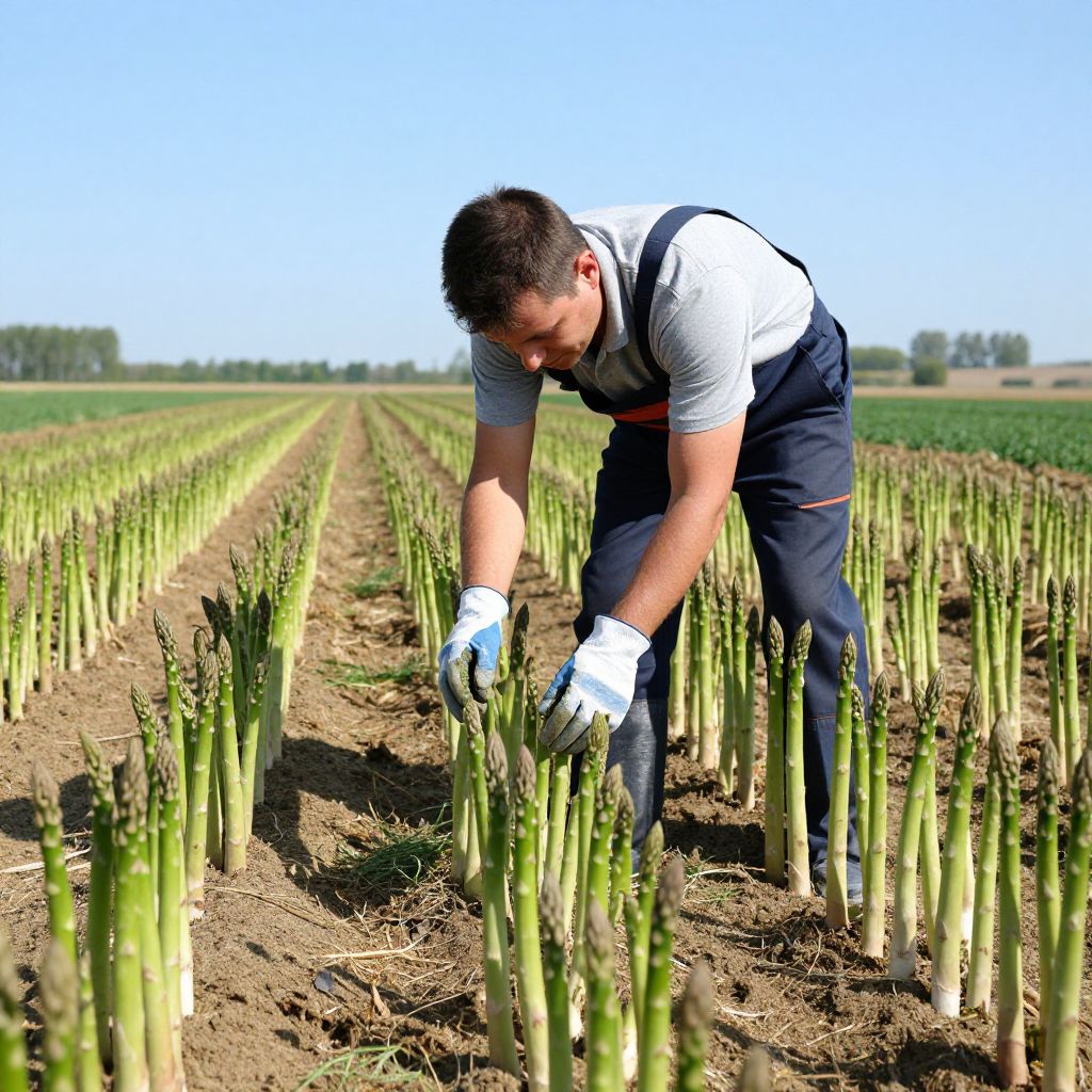 A close-up photograph of a person's hands holding a bunch of green asparagus with brown tips. The person is wearing dark blue jeans and black rubber boots. The background is a blurred field with brown, tilled soil and some green plants. The person's skin is light-toned, and their fingers are slightly dirty from handling the soil. The asparagus is fresh and slightly curved, with a mix of green and brown hues. The image captures the texture of the soil and the smooth, slightly shiny surface of the asparagus. The lighting is natural, highlighting the details of the hands and the vegetables.
