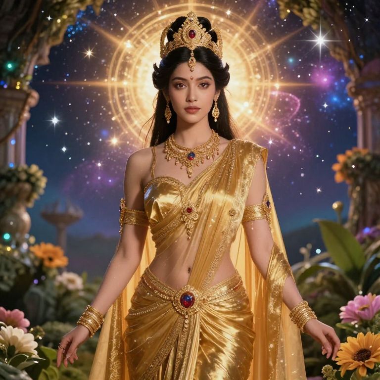 Lalita, portrayed as a goddess-like figure with radiant golden attire, ornate jewelry, standing amidst a celestial garden with shimmering stars, detailed textures on fabric and skin, vibrant and mystical environment infused with spiritual energy.