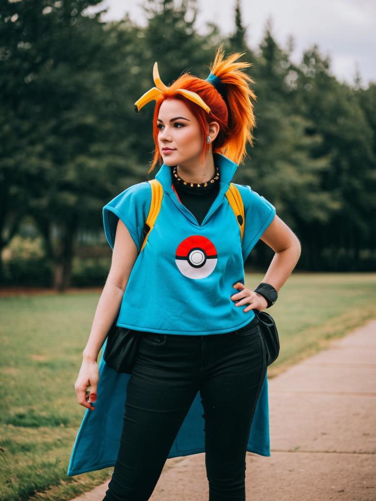 Photo-realistic cosplay photo of person in alder (pokemon) costume. 1boy, orange hair, red hair, long hair, two-tone hair, facial hair, arm hair, spiked hair, leg hair, ponytail, hair tie, popped collar, necklace, poncho, poke ball (basic), poke balllifestyle stock photo, shallow depth of field, lifestyle stock photography, shallow depth of field, natural lighting, warm tones, soft background blur, candid moments, vibrant colors, realistic textures, modern casual clothing. full body shot
