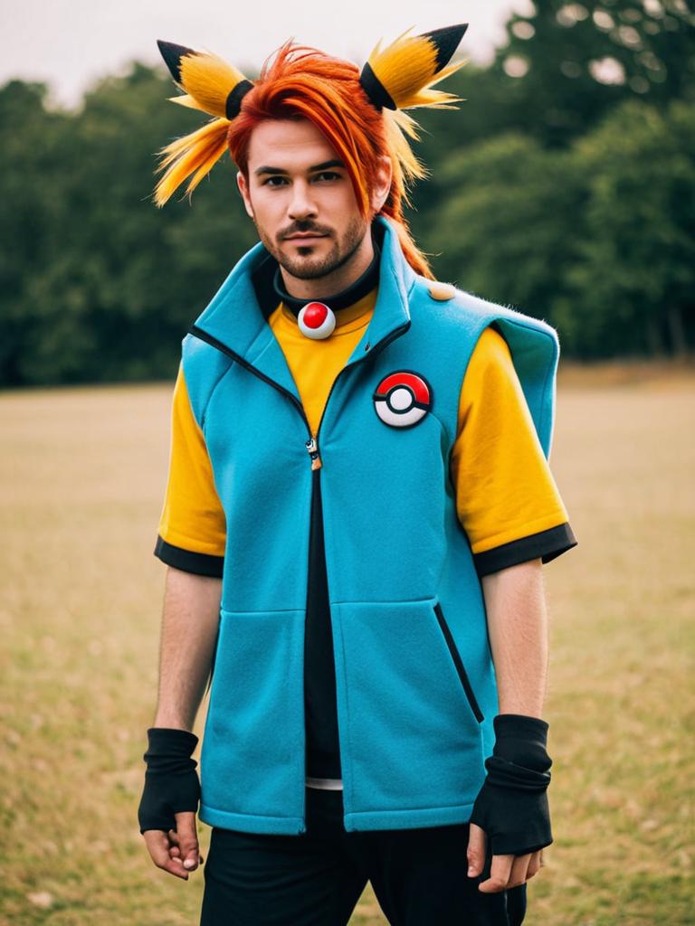 Photo-realistic image of a man dressed in a Pokemon Alder cosplay costume. The subject has vibrant orange and red hair styled with black and yellow ear-like accessories and a ponytail. He is wearing a blue sleeveless vest with a Pokeball emblem over a yellow shirt, accessorized with black fingerless gloves and a red and white Pokeball necklace. The photo is taken outdoors with natural lighting and a blurred forest background.