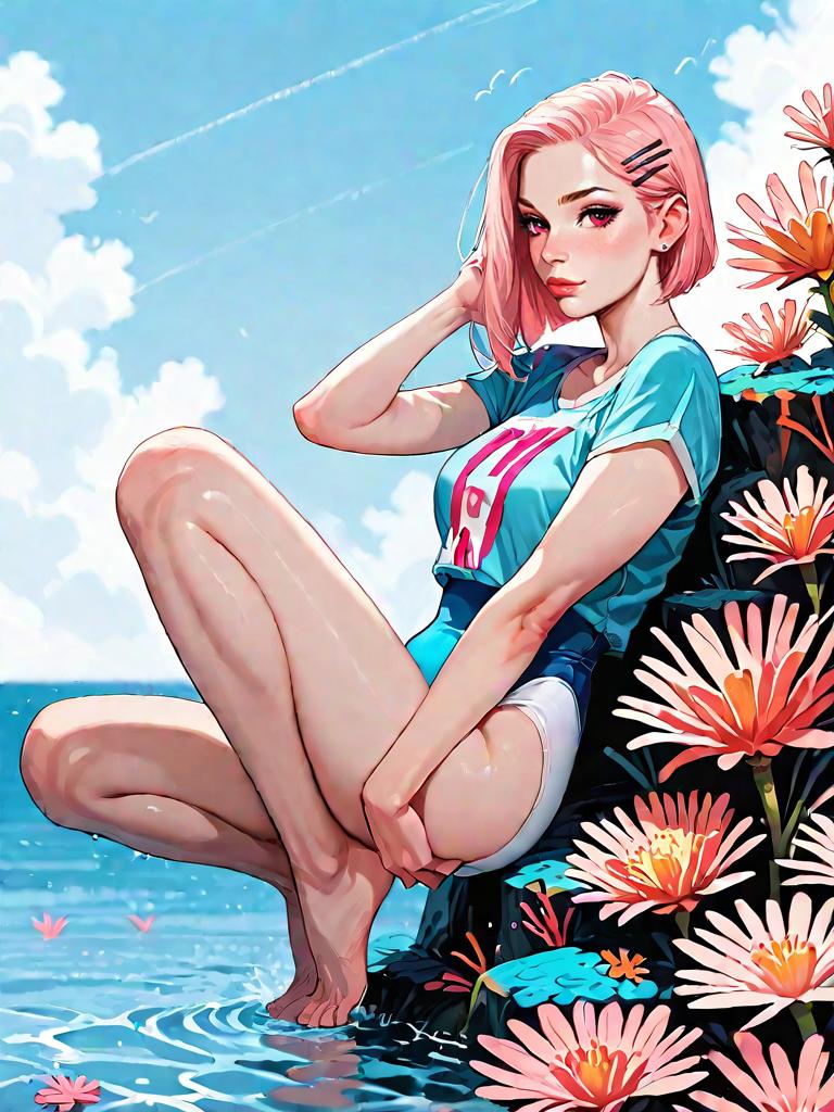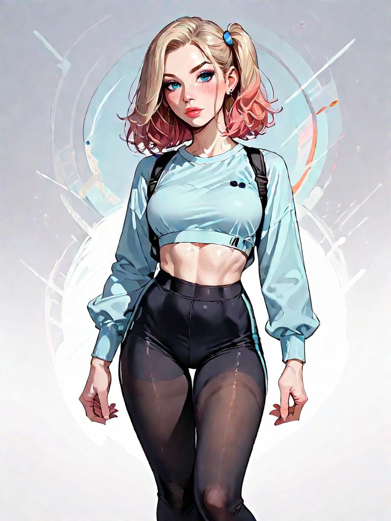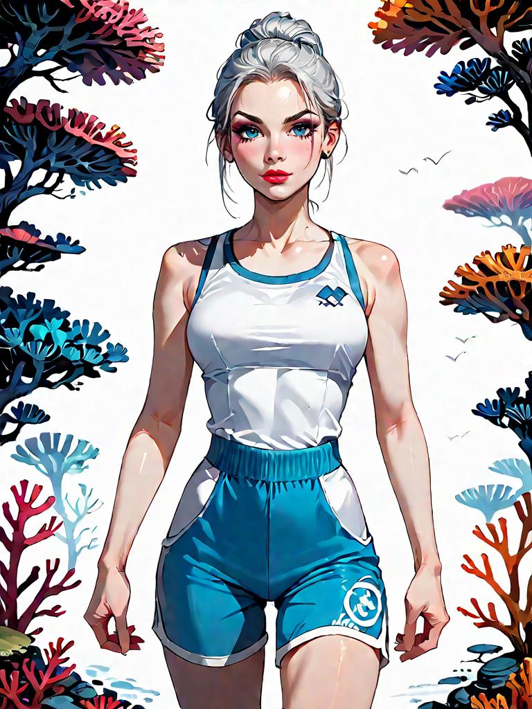 1girl, source_comics, realistic face, full body shot, Woman, sporty chic, coral pink sports bra with racerback and mesh detail, matching high-waisted tennis skirt with pleats, plain white studio background