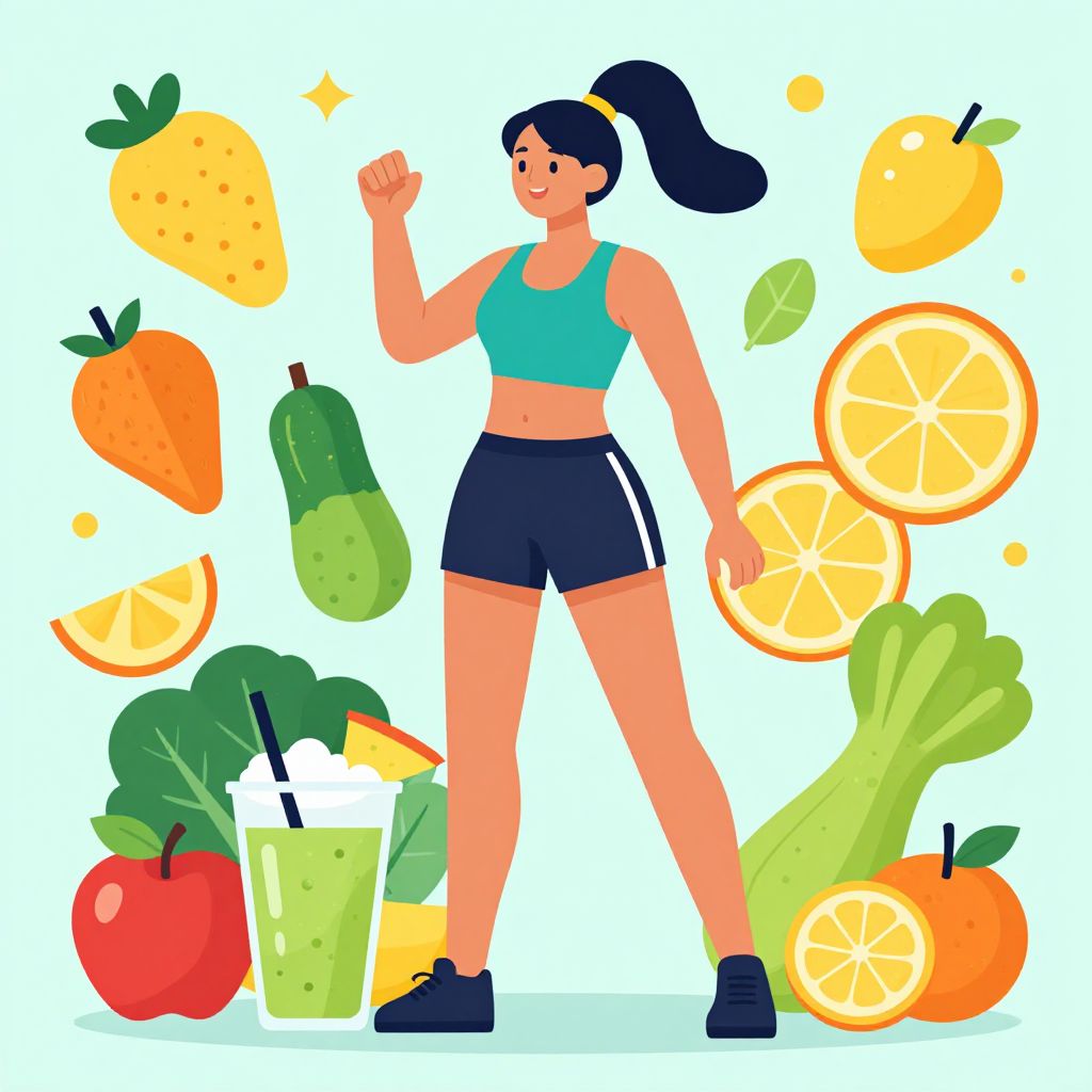 A vibrant vector illustration featuring a fit woman in athletic attire surrounded by colorful fruits, vegetables, and a smoothie, embodying a healthy lifestyle with bold, flat colors and clean lines characteristic of modern digital art.