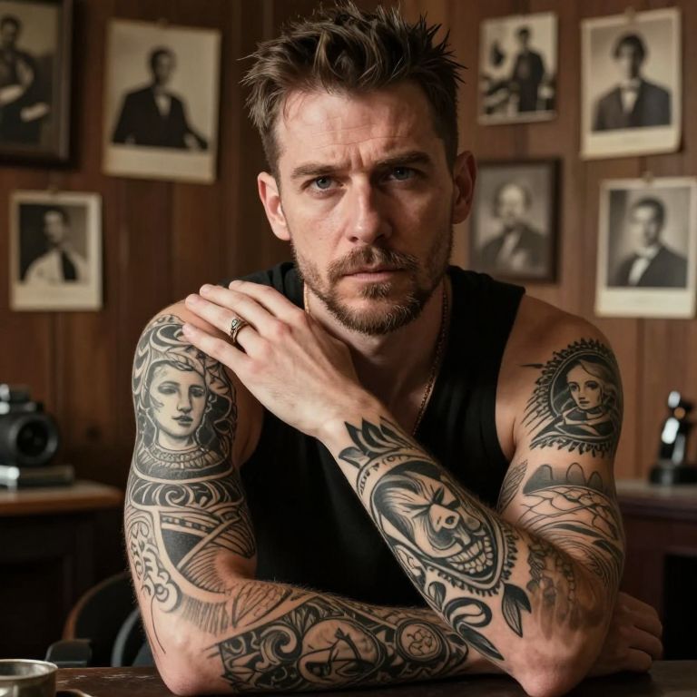 Hyperrealistic portrait of a charismatic tattoo artist in their mid-thirties, showcasing intricate body art on both arms. Soft natural light casts dramatic shadows across their rugged features, highlighting an intense gaze and passion for their craft. The scene is set in a dimly lit vintage photography studio with an old-fashioned wooden backdrop adorned by sepia-toned photographs, creating an atmosphere rich in history and artistic vision. Captured from a unique low angle, the portrait evokes admiration and curiosity, hinting at the dedication of this artistic visionary.