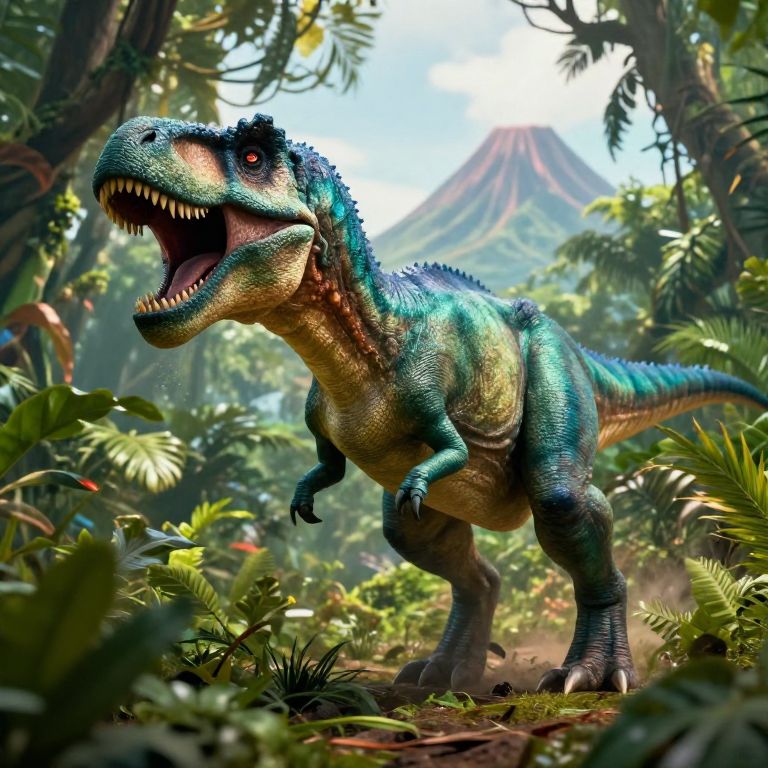 CGI image of a vibrant, blue-green, dinosaur with sharp teeth roaring in a lush, dense jungle with ferns and sunlight. Volcano in