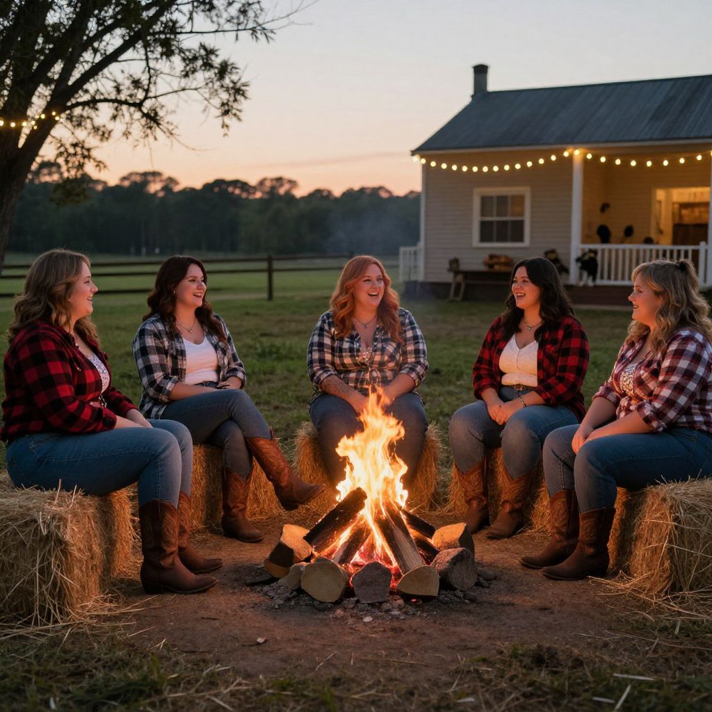 Photograph of five women sitting around a campfire at dusk. They wear plaid shirts, jeans, and boots, with hay bales as seats. The central woman with red hair smiles, surrounded by friends with various hair colors. A cozy farmhouse with string lights is in the background, silhouetted against a pink and blue sunset. The fire casts warm light, creating a rustic, relaxed atmosphere in a grassy field. Trees and a darkening sky frame the scene.