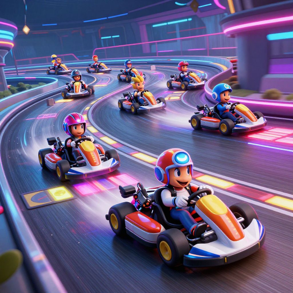 Mariokart style intense kart race on a twisting neon-lit futuristic track, glowing boost pads, diverse characters with vibrant costumes, lively animations, shiny metallic and plastic kart textures, dramatic lighting with reflections, energetic action moment