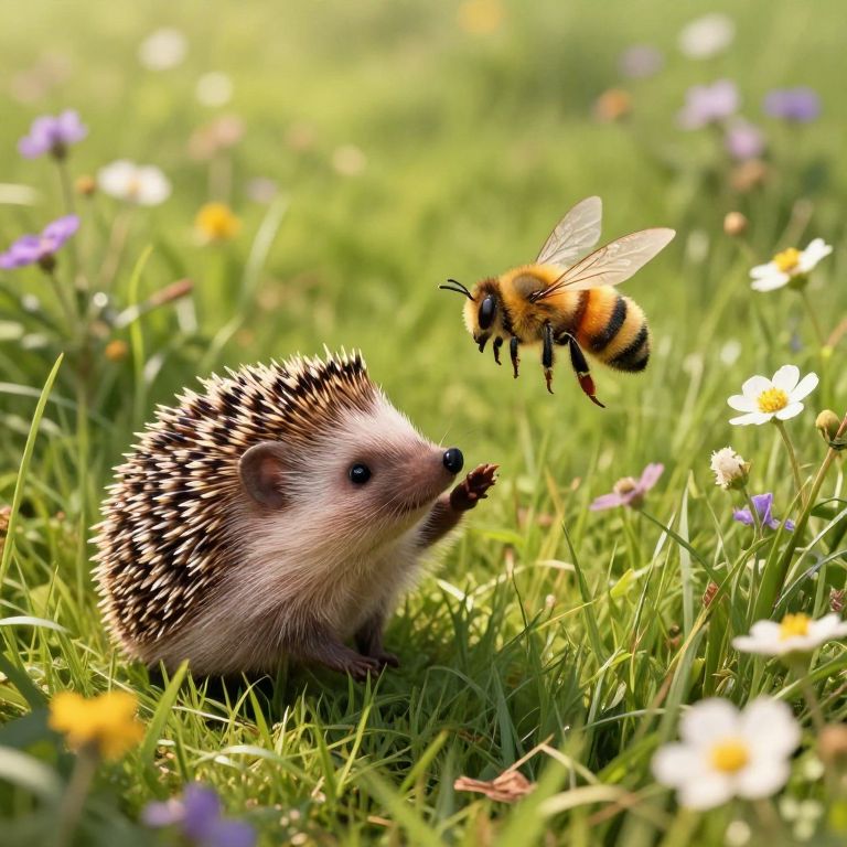 Photograph of a vibrant, sunlit meadow featuring a honeybee with translucent wings and yellow-black stripes hovering near a hedgehog with white and black spines. The hedgehog is positioned in the lower left, facing the bee, which is in mid-flight to the right. The background is a lush green field dotted with small white and purple wildflowers. The image is brightly lit with a shallow depth of field, creating a blurred, dreamy effect in the background. The bee's delicate wings contrast with the hedgehog's spiky texture, emphasizing their interaction.