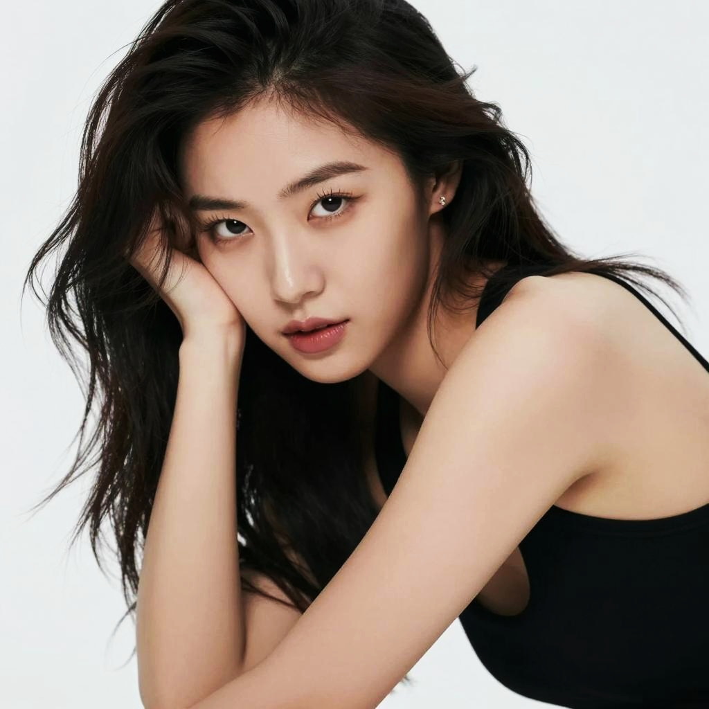 An artistic portrayal of a confident woman with a sultry expression, styled with an analog film aesthetic. The image features the woman in a suggestive pose, evoking a sexy and alluring mood.