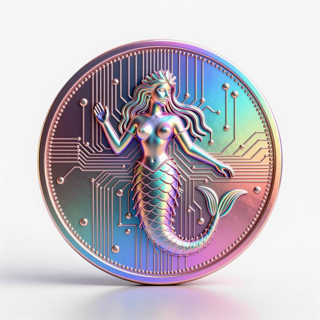 Highly detailed 3D rendered image of a technologically advanced ancient coin featuring a neon rainbow hued metallic mermaid with circuit board patterns in the background. The coin showcases intricate details with a futuristic and ancient fusion design, created with high-resolution digital art using advanced rendering techniques.