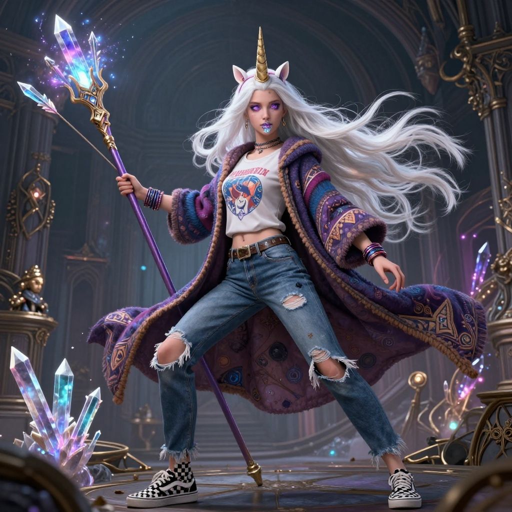 Digital artwork of a fantasy character with long white hair, a unicorn horn, and blue lipstick. She wears a white crop top with a colorful design, ripped blue jeans, and a long, patterned purple robe. She holds a glowing crystal staff in her right hand and stands in a dark, ornate hall with glowing crystals on the floor and walls. Her black-and-white checkered shoes add a modern touch. The background features grand, gothic architecture with intricate details. The overall style is vibrant and magical, blending fantasy and modern elements.