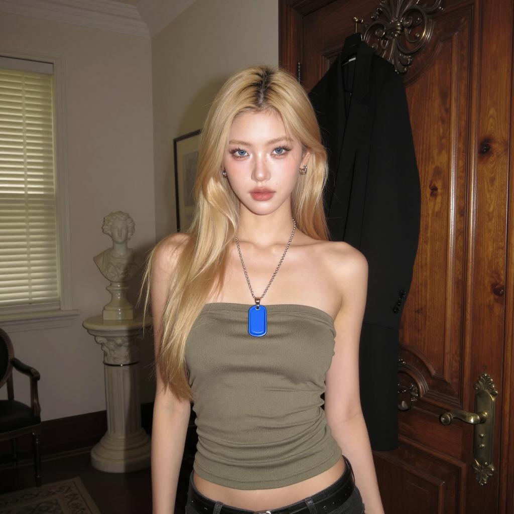 Blonde woman with long hair in a green tube top stands in a dimly lit room. She wears a blue dog tag necklace. Black coat hangs on a door behind her. Ornate wooden door on the right. Marble statue in the background near a window with blinds.