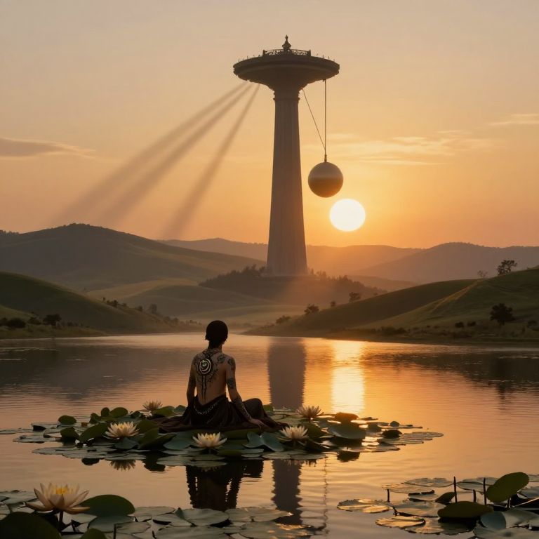 Photograph of a serene sunset scene featuring a silhouetted, tattooed person with dark skin, sitting on lily pads in a calm lake. They face a tall, futuristic tower with two hanging orbs, illuminated by sun rays. The background shows rolling hills and a gradient sky from orange to yellow. The water reflects the sun and tower, creating a peaceful, otherworldly atmosphere. Lilies and reeds are scattered in the foreground, enhancing the natural setting. The overall composition blends futuristic and natural elements.