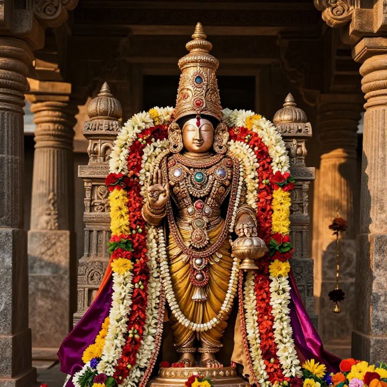 Venkateswara deity adorned with colorful garlands and jewels, ancient temple backdrop with stone pillars and carvings, morning light casting gentle shadows, highly detailed and golden hues, mystical and serene atmosphere, intricate craftsmanship
