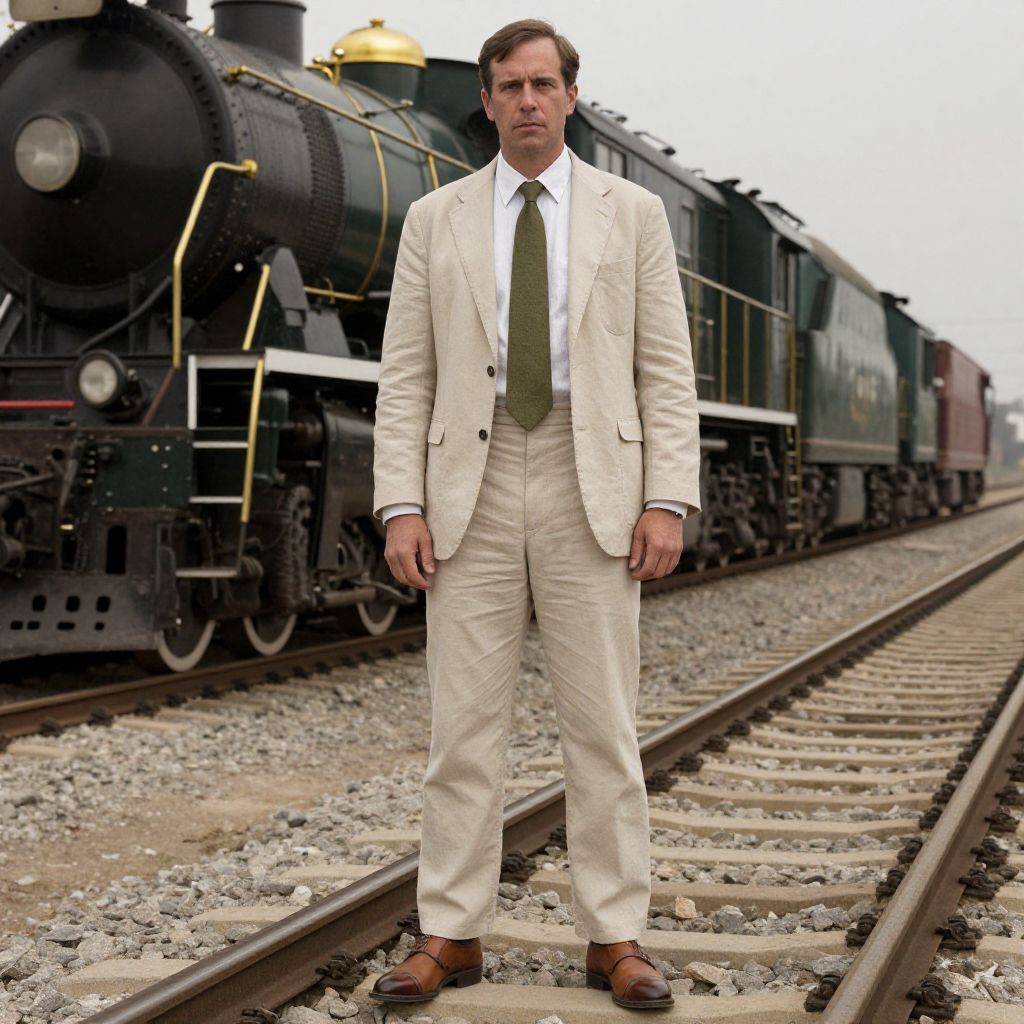 A man, beige cotton suit, white linen dress shirt, olive green tie, brown leather monk strap shoes, vintage locomotives, polished brass fittings, expansive railway tracks, vintage photo style, confident expression Man has masculine face and piercing eyes
