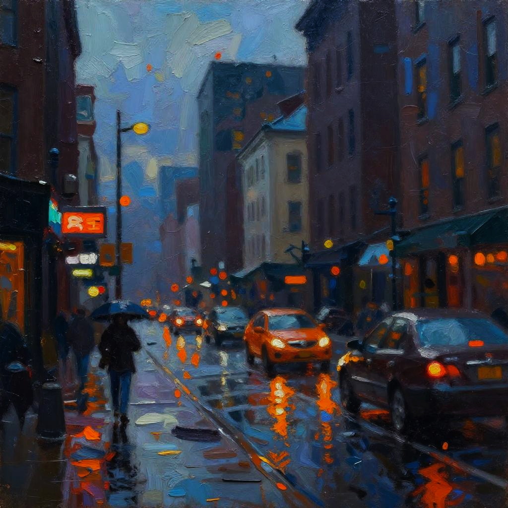 AI turn photo into painting, dramatic oil painting of an urban cityscape at dusk, thick impasto textures, rich dark blues and fiery oranges, dynamic brushstrokes conveying motion and life in a rainy street scene
