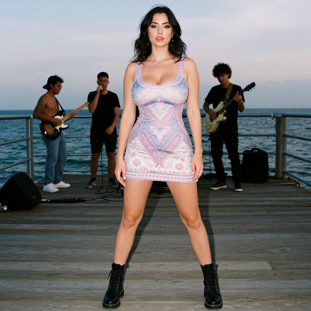 A woman, in a chromogenic film style, wearing a sleeveless mini dress with a paisley print in lavender, pink, and white, paired with black combat boots, standing on a pier with a musician playing. Sexy. Pretty face and beаutiful eyes. Big breasts.
