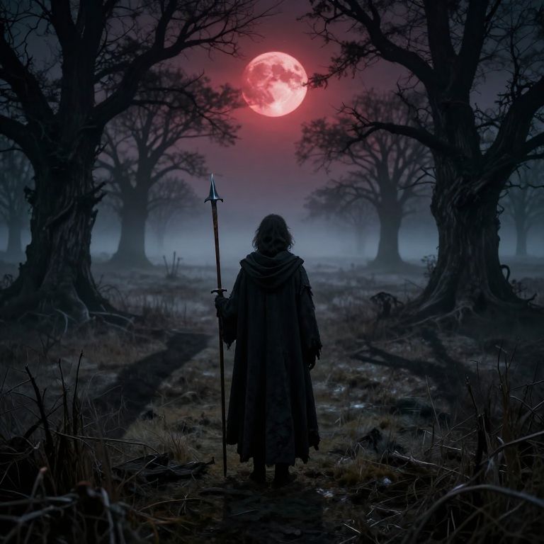 Digital artwork depicting a dark, eerie forest at night. A silhouetted figure with long hair, cloaked in a tattered, dark robe, stands facing a large, glowing red full moon. The figure holds a tall, double-headed spear. The forest is dense with tall, barren trees with twisted branches, casting long shadows on the ground. The scene is shrouded in a misty, blue-gray fog, adding to the ominous atmosphere. The ground is littered with dry grass and small rocks. The overall color palette is dark and moody, with deep blues and blacks contrasting with the vibrant red moon.