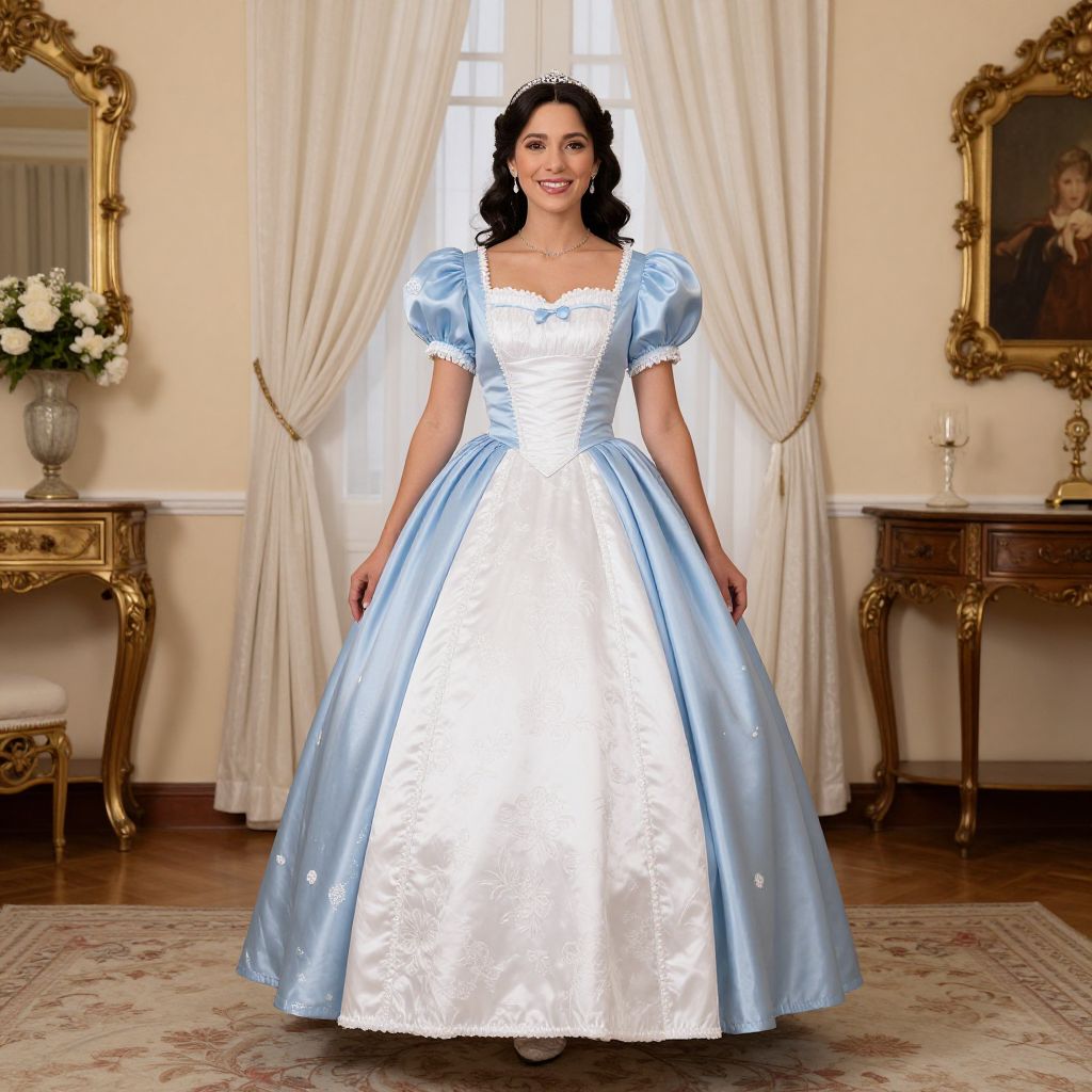 Photograph of a smiling woman with fair skin and dark curly hair, wearing a light blue and white satin princess-style ball gown with puffed short sleeves and a fitted bodice. She has a small tiara on her head. The background features a luxurious room with cream-colored walls, white curtains, and two ornate gold-framed mirrors. A wooden console table with a vase of white flowers and a candlestick is on the left, while another similar table is on the right. The woman stands on a patterned rug with polished wooden floors.