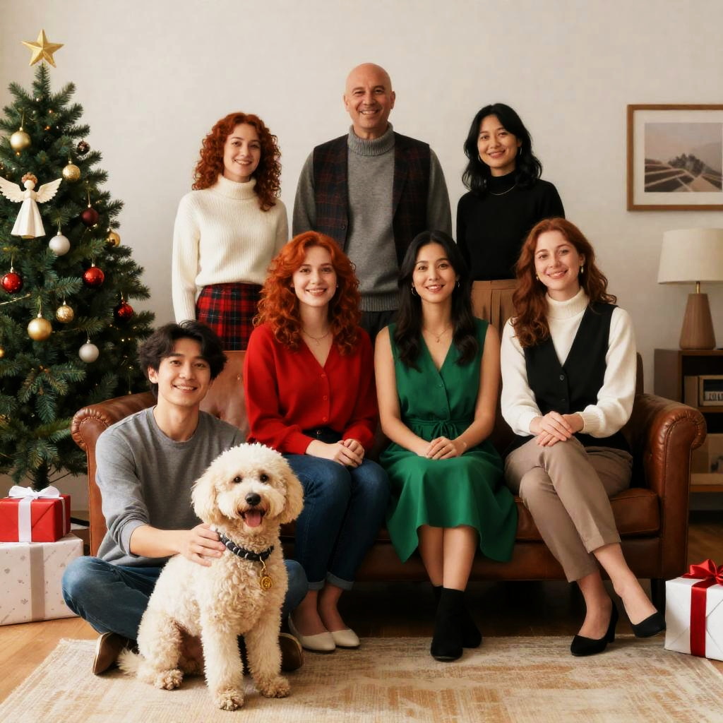 A warm indoor Christmas portrait featuring seven diverse adults and a curly white dog. The group poses in a living room decorated with a Christmas tree adorned with gold and red ornaments and an angel topper. Wrapped gifts are placed beside the tree and sofa. Individuals wear casual to semi-formal winter attire including a white turtleneck, red and green tops, plaid skirt, black vest, and brown leather shoes. The scene exudes a festive, cozy atmosphere with neutral wall art and soft lighting.