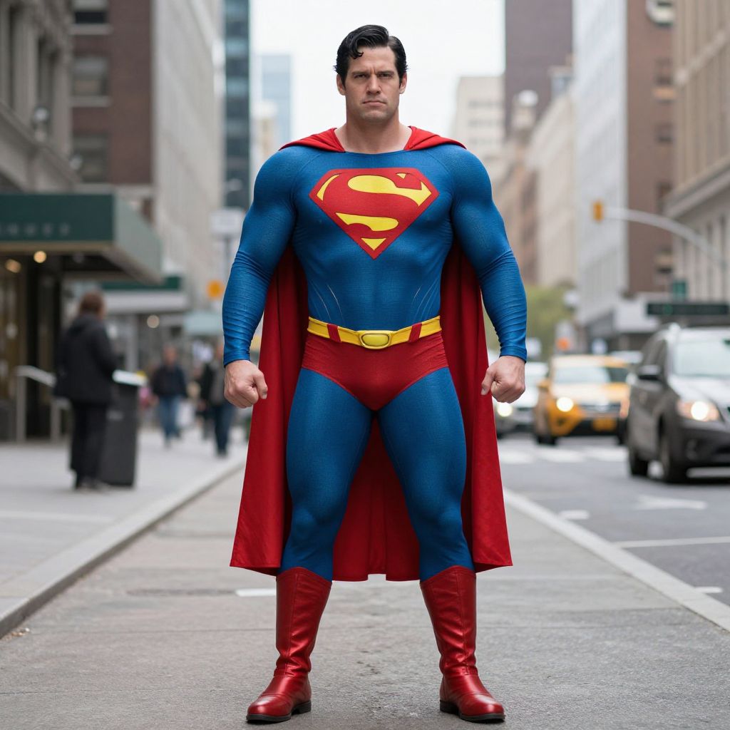 Photograph of a muscular man in a Superman costume standing confidently on a city street, with blurred buildings and traffic in the background. Red cape, blue