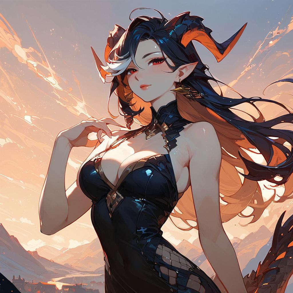 Score_9, score_8_up, score_7_up, score_6_up, score_5_up, score_4_up, (sourse_furry:1.1), (oni girl:1.1), long fur, (toned body:1.1), thin, slender, gold long hair, (medium breasts:1.2), (chest fur:1.1), (furry limbs), (skimpy black dress:1.3), blue skin, (small head:1.3), 4arms, extra arms, (Posing:1.2), sexy pose