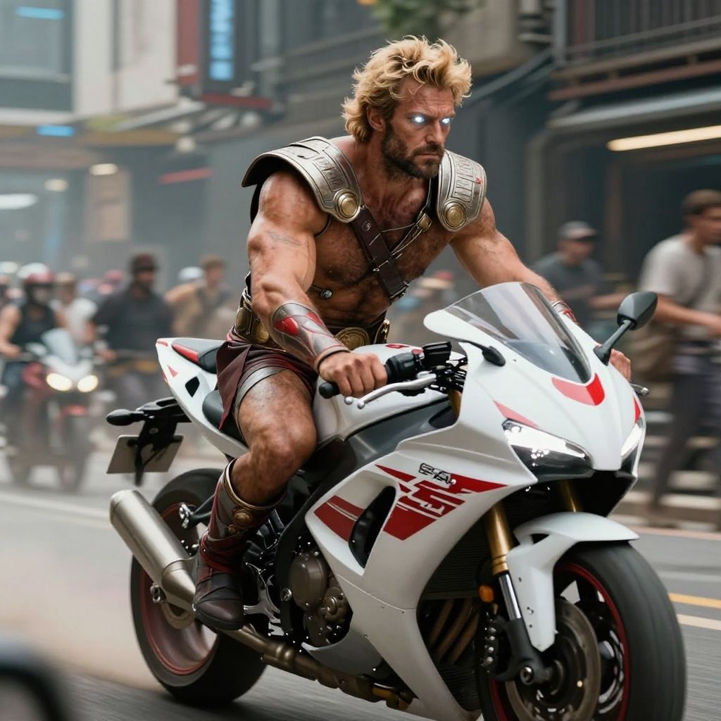 Cinematic, cyberpunk, futuristic, mythology, full body action shot. muscular, hairy-chested, 30-year-old, Greek supervillain. his skin is a medium-tan hue. wide face, short wavy blond hair, stubble. (sleeveless, white and red, ornate cybernetic armor:1.5). silver glowing eyes. he rides a sports-motorcycle through a populous cyberpunk Troy.