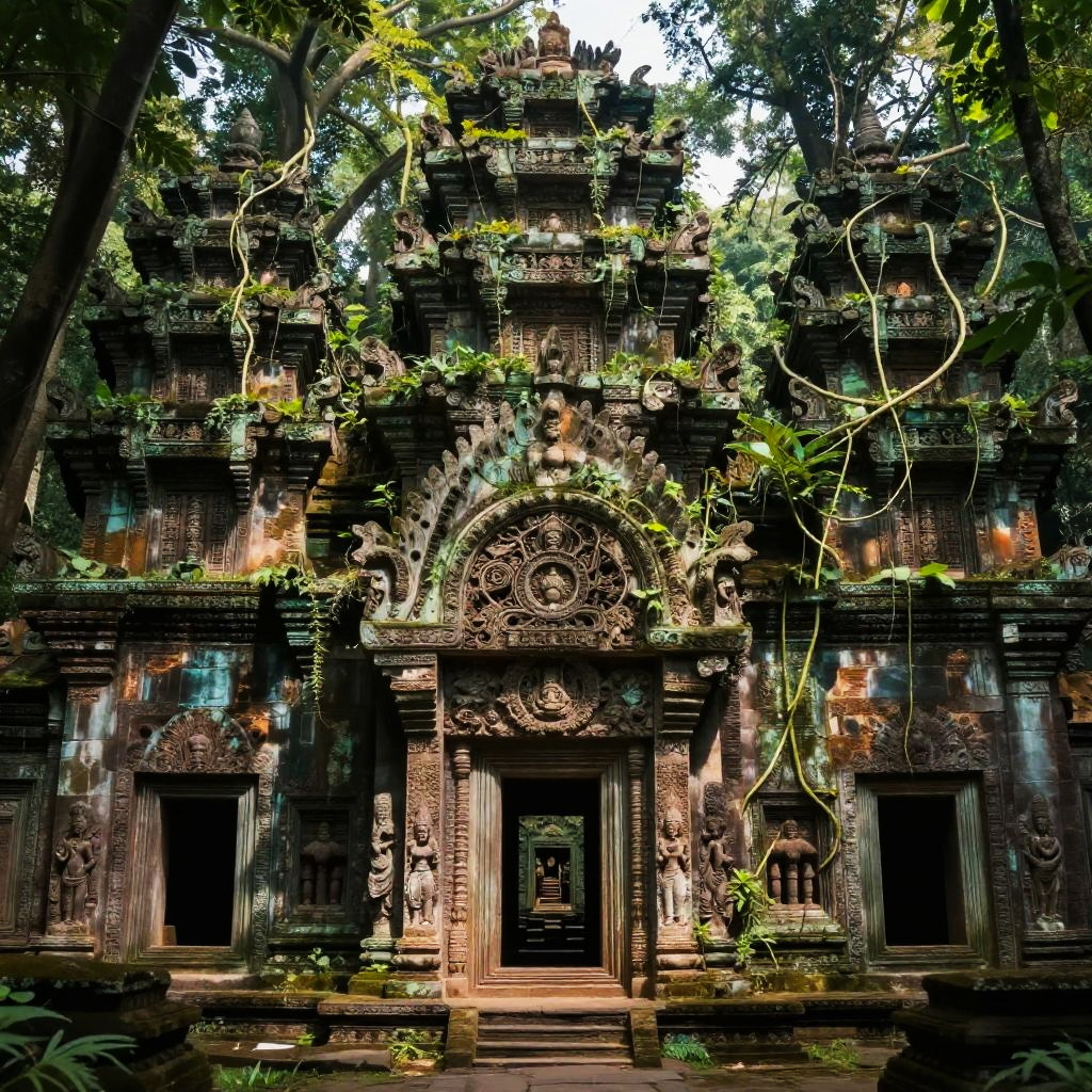 Generate variations of an image portraying an ancient temple hidden in dense jungle, overgrown with vines, mysterious lighting, and detailed stone carvings, adventure illustration style