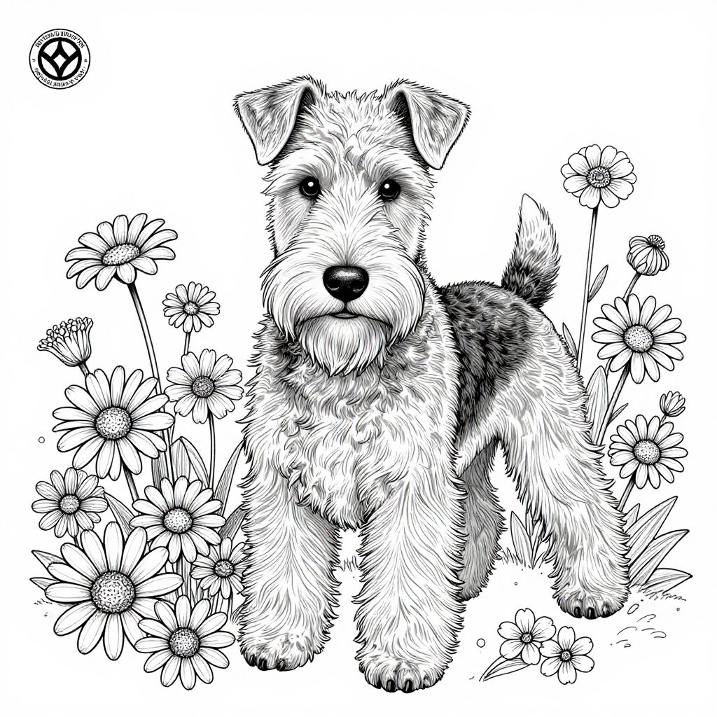 The image is a highly detailed, black-and-white coloring page for adults, featuring a meticulously drawn Airedale Terrier amidst a floral background. The dog, with its characteristic wiry coat and expressive eyes, is the central figure, occupying the majority of the space. The fine line art technique used in the drawing allows for intricate details, such as the texture of the dog's fur and the delicate lines of its facial features, to be clearly visible. Surrounding the dog are various flowers, including daisies and other wildflowers, which are arranged in a natural, somewhat scattered manner, creating a sense of depth and dimension. The background is a clean white, which contrasts sharply with the black lines of the drawing, making the intricate details stand out prominently. The overall composition is balanced, with the dog positioned slightly to the left, allowing the flowers to frame the image and draw the viewer's eye towards the central subject. The image is marked with a logo in the top left corner, indicating the artist or brand associated with the coloring page.