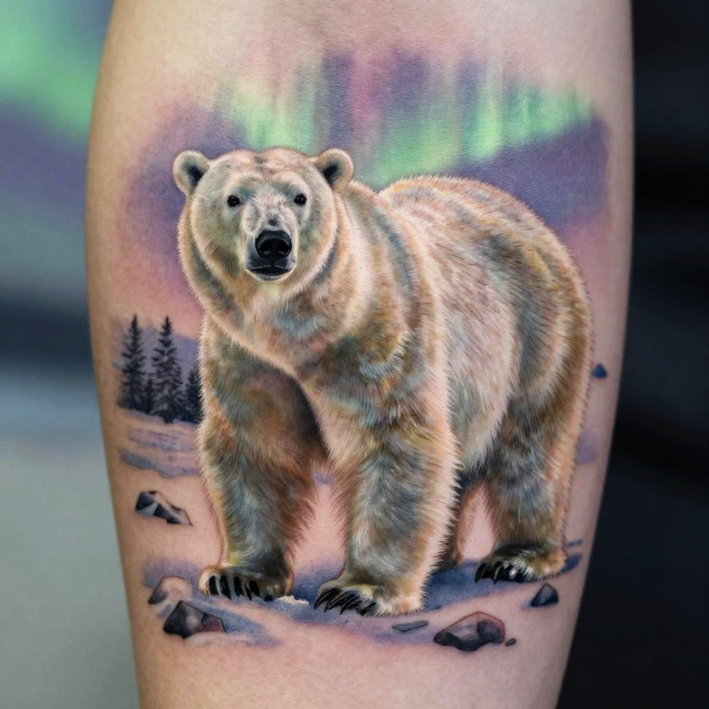 Realistic polar bear tattoo featuring a majestic bear standing on snowy rocks, detailed fur texture and naturalistic lighting, complemented by a northern lights background in soft pastel hues, hyperrealistic style with fine line art.