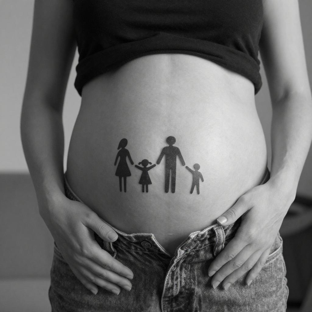 Black and white photo of a pregnant woman's midsection, taken from a slightly low angle. She's wearing unbuttoned jeans, with her hands resting on her belly. A simple stick figure tattoo of a family (mom, dad, and child) is on her belly. The background is blurred, focusing on her and the tattoo. Lighting is soft, highlighting her belly and hands. Depth of field is shallow.