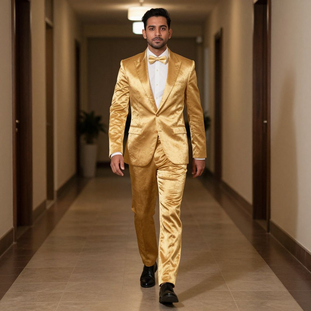 Man Outfit Party Costume, man in a gold suit walking down a hall
