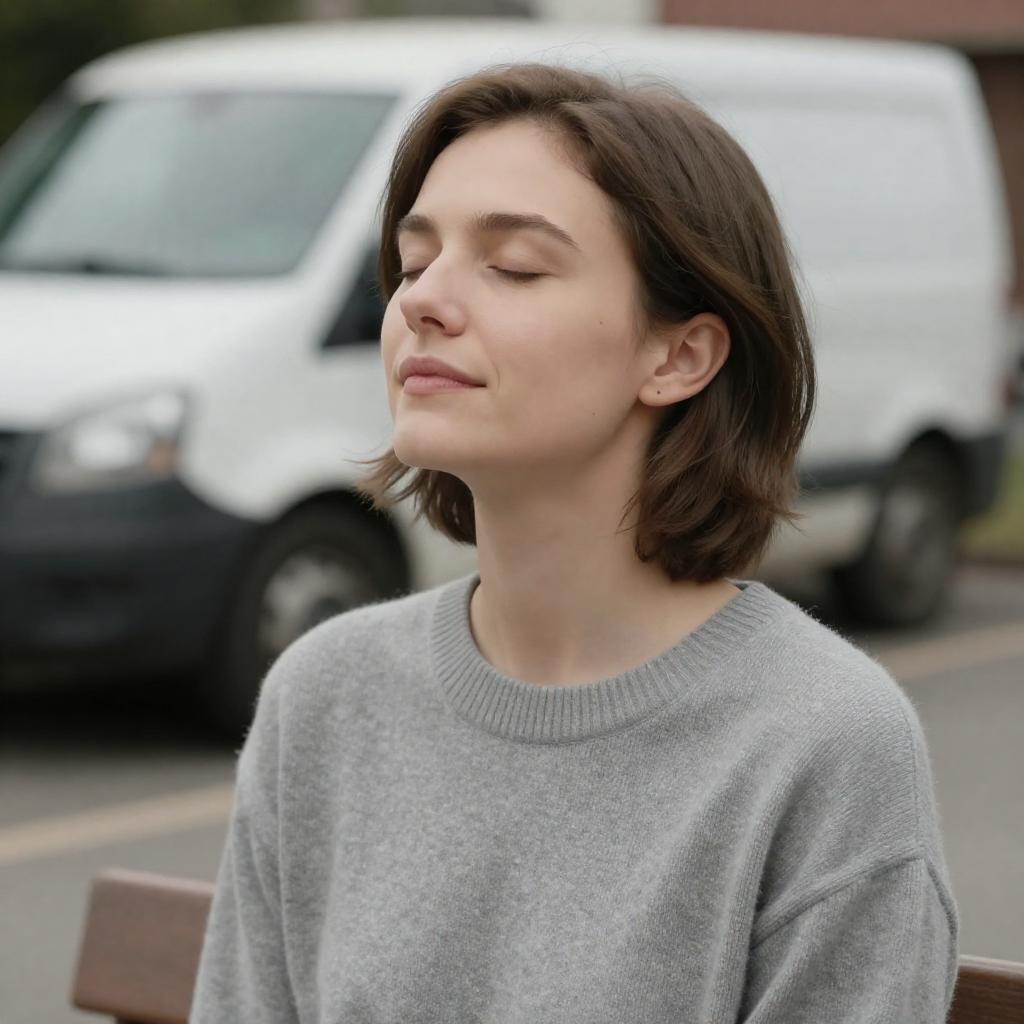 Photograph of a fair-skinned woman with closed eyes, short brown hair, wearing a gray ribbed sweater, seated outdoors. Background includes a blurred white van and a tree. Her face is relaxed, expression serene. She has a small mole under her right eye.