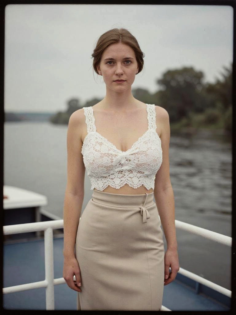 A woman, chic in a black cropped top and a geometric patterned pencil skirt, seated at a lakeside dock chair, captured in the visual style of daguerreotype film. Sexy. Pretty face and beаutiful eyes. Big breasts