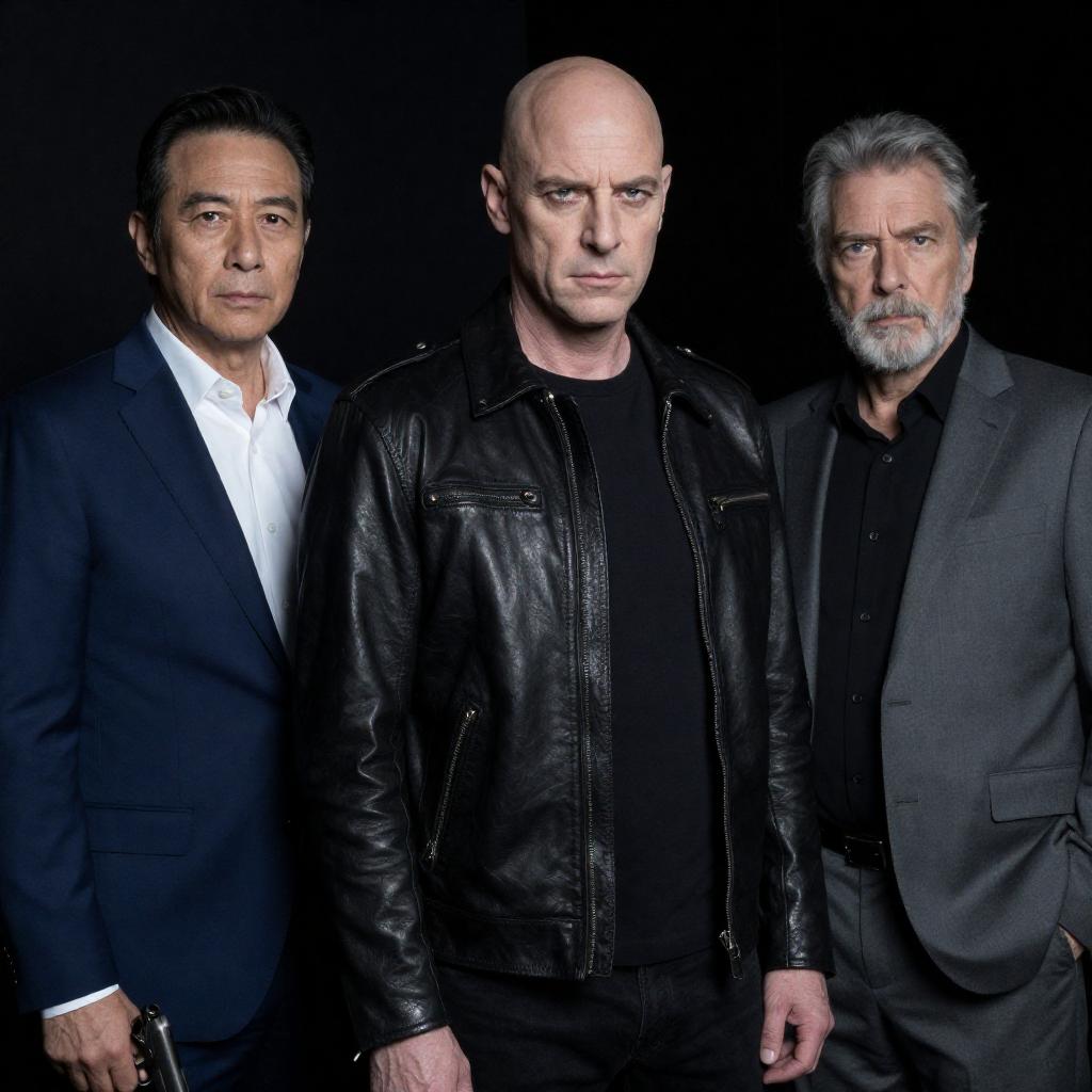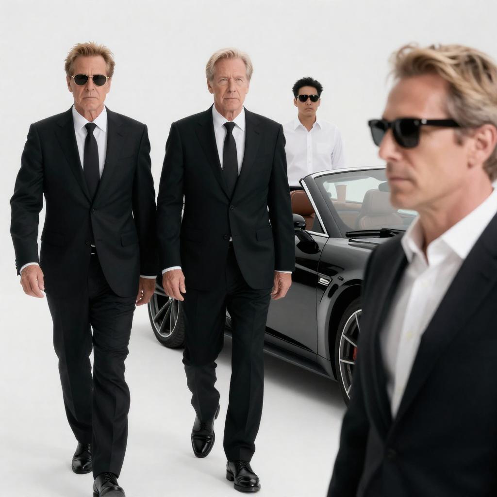 Composite image showing four mature men with varying attire. Two men on the left are in black-and-white suits, one holding a cane. Center front man has grey beard, sunglasses, and grey suit. Background contains a bald, stern man in gray suit. On the right, an older man with gray hair wearing sunglasses, a green jacket, and a dark shirt stands beside a classic black convertible car on a white background.