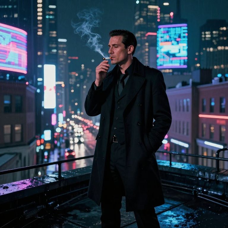 Gangster prompts latest: A gritty, neon-lit urban rooftop scene at night, featuring a lone gangster in a tailored black coat, smoking a cigarette, overlooking a bustling city with holographic billboards and rain-slicked streets, cinematic lighting, cinematic atmosphere, Flux style.