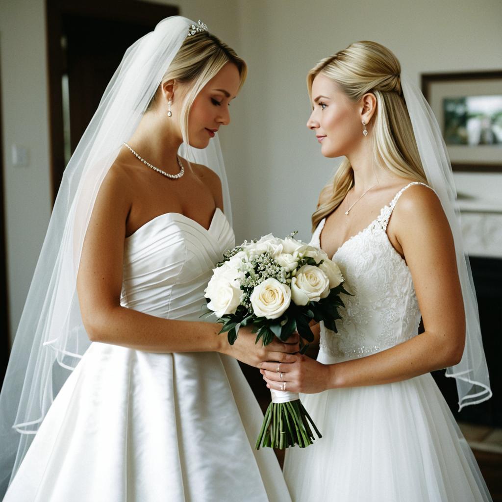 Groom seeing wedding dress,1girl, dress, wedding dress, bouquet, flower, white dress, bride, indoors, veil, bridal veil, holding, blonde hair, holding bouquet, jewelry