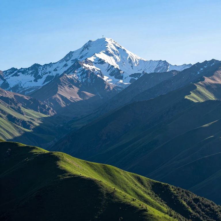 Photograph of a majestic mountain range under a clear blue sky. The tallest peak is snow-covered and bathed in sunlight, contrasting with the darker, shadowed slopes below. The foreground features lush, green hills with sunlight casting sharp shadows, highlighting the terrain's texture. The mountain's rugged, rocky surfaces are visible, with patches of snow and greenery. The image captures the serene beauty and dramatic contrast of light and shadow in a natural landscape.