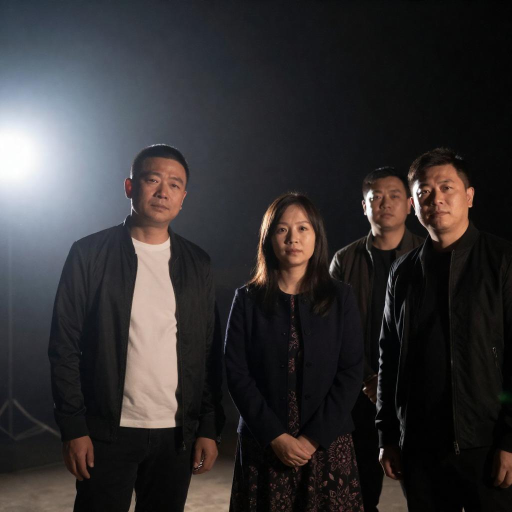 Photograph of three Asian individuals in a modern room. A woman with long brown hair in a braid, black cape, and striped shirt stands behind two seated men. The man on the left wears a black beanie and black jacket, while the man on the right has short black hair, a graphic t-shirt, and tattoos on his arms. Background includes a white couch and a dark blue wall.