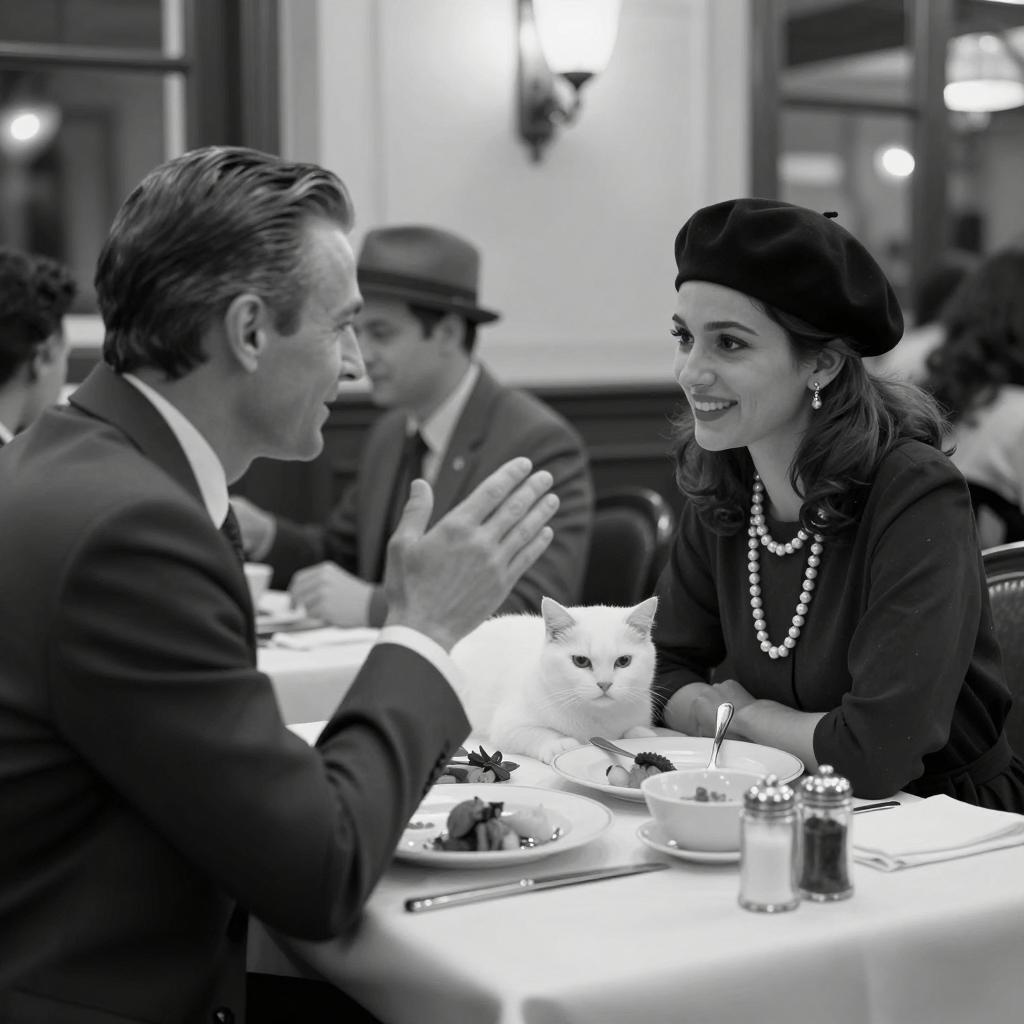 Black and white photo of a man and woman dining at a classic restaurant. The man, dressed in a suit with slicked-back hair, is gesturing with his right hand, facing the woman. The woman wears a dark dress, pearl necklace, pearl earrings, and a beret, smiling warmly. A white cat rests on the table between them. Plates of food, a bowl, and salt and pepper shakers are visible on the table. Another man in a hat is in the background, adding to the vintage ambiance.