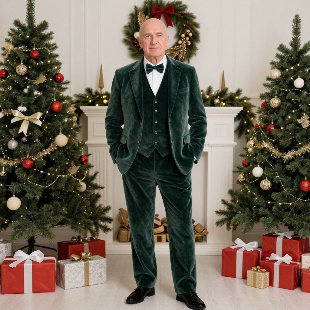 Portrait of an older bald man wearing a green velvet three-piece suit standing confidently indoors surrounded by decorated Christmas trees, holiday wreaths, and wrapped gifts, evoking a festive Christmas atmosphere.