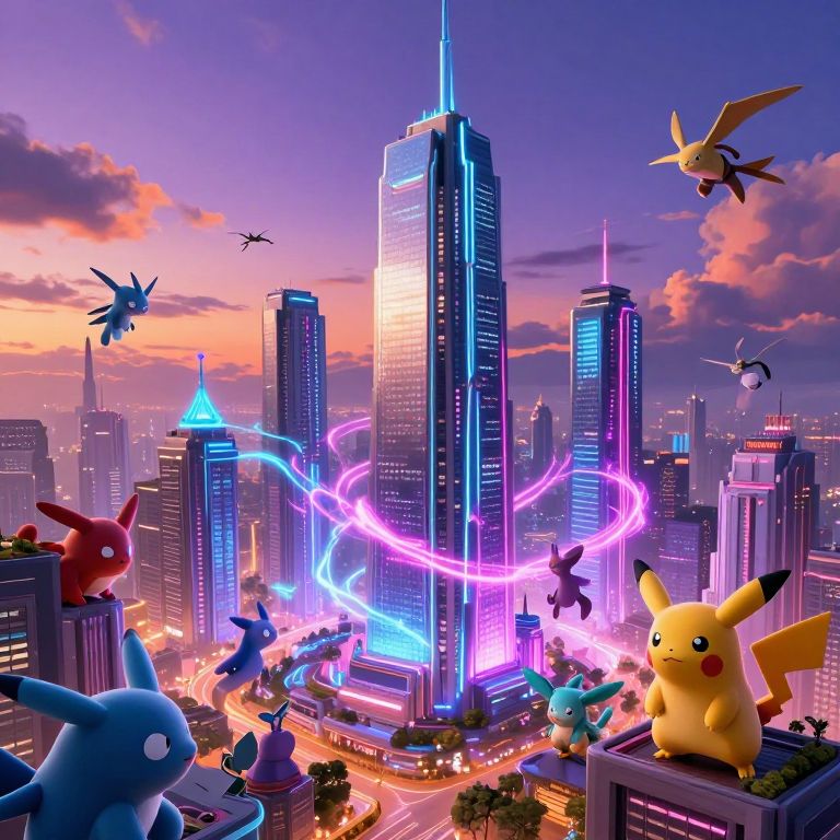 A detailed futuristic cityscape featuring various mysterious creatures inspired by the keyword pokemonn, vibrant neon lights reflecting off towering skyscrapers, dynamic energy flows, and a dusk sky blended with shades of purple and orange, ultra-realistic style.