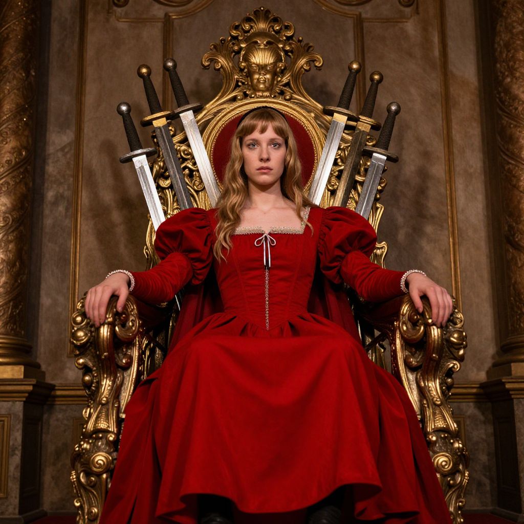 Photograph-style digital artwork depicting a young woman with long, wavy blonde hair and pale skin, wearing a deep red, Renaissance-style dress with puffed sleeves and a white ribbon at the neckline. She sits on an ornate, golden throne with an intricate design and four crossed swords behind her. Her expression is serious and slightly intimidating. The background features dark, textured walls with gold accents. The overall mood is regal yet ominous, with the rich red of her dress contrasting sharply against the dark, gold-trimmed background.