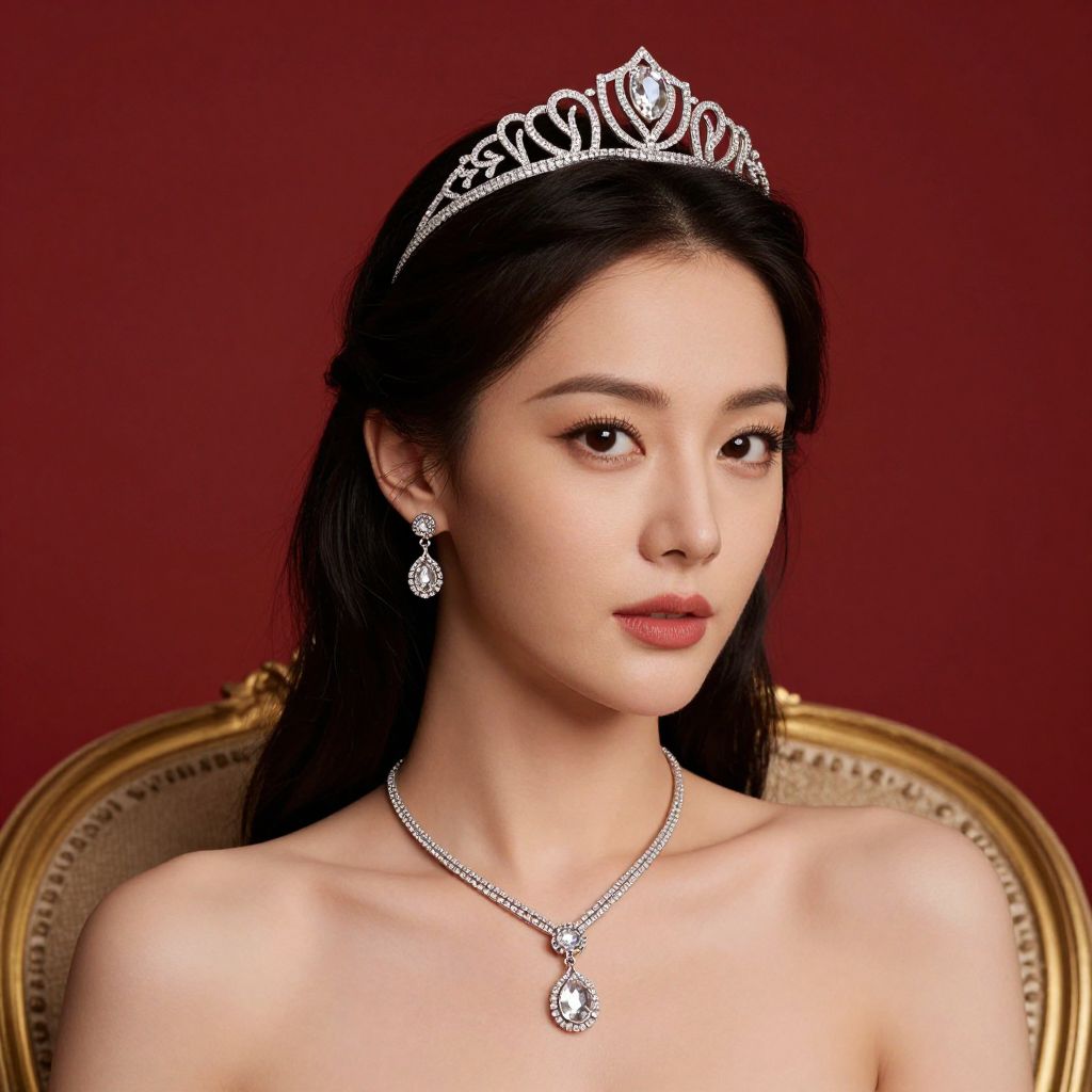 Woman wearing a Cartier Essex Tiara replica, adorned with a sparkling diamond necklace and matching earrings, seated elegantly in a gold-framed chair against a rich red backdrop, exuding a regal and luxurious presence.