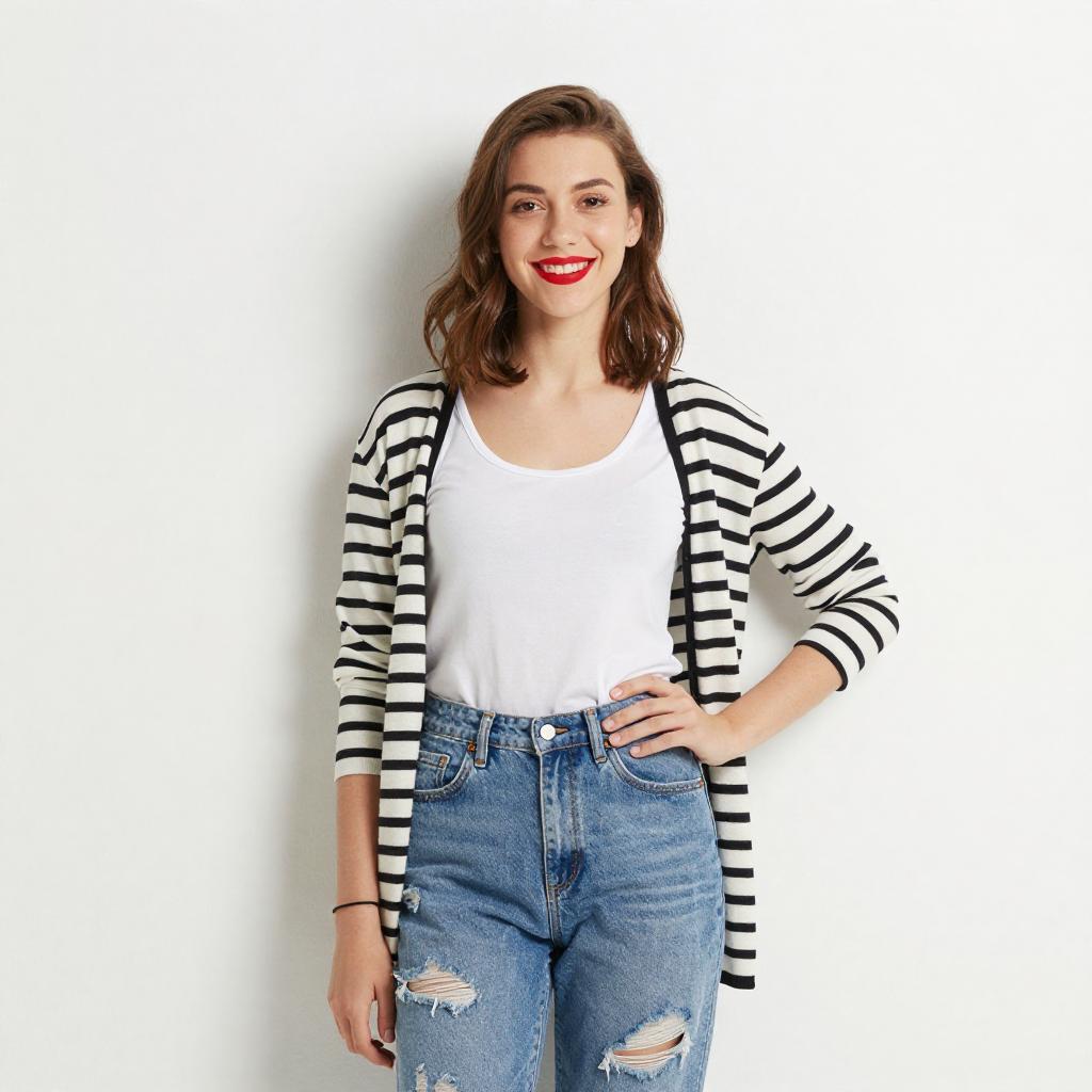 Photograph of a young woman with light skin and long brown hair in a ponytail, wearing a dark blue, short-sleeved shirt and beige pants. She stands against a bright blue background, looking over her shoulder with a slight smile. Her right hand rests on her hip, and a small cluster of purple dots is visible in the bottom right corner.