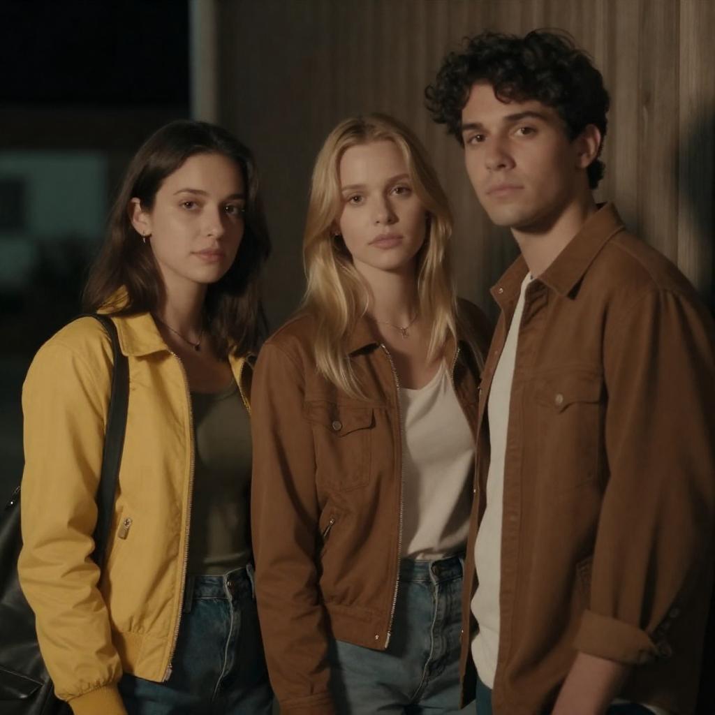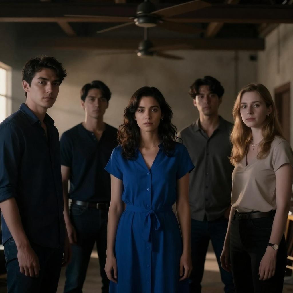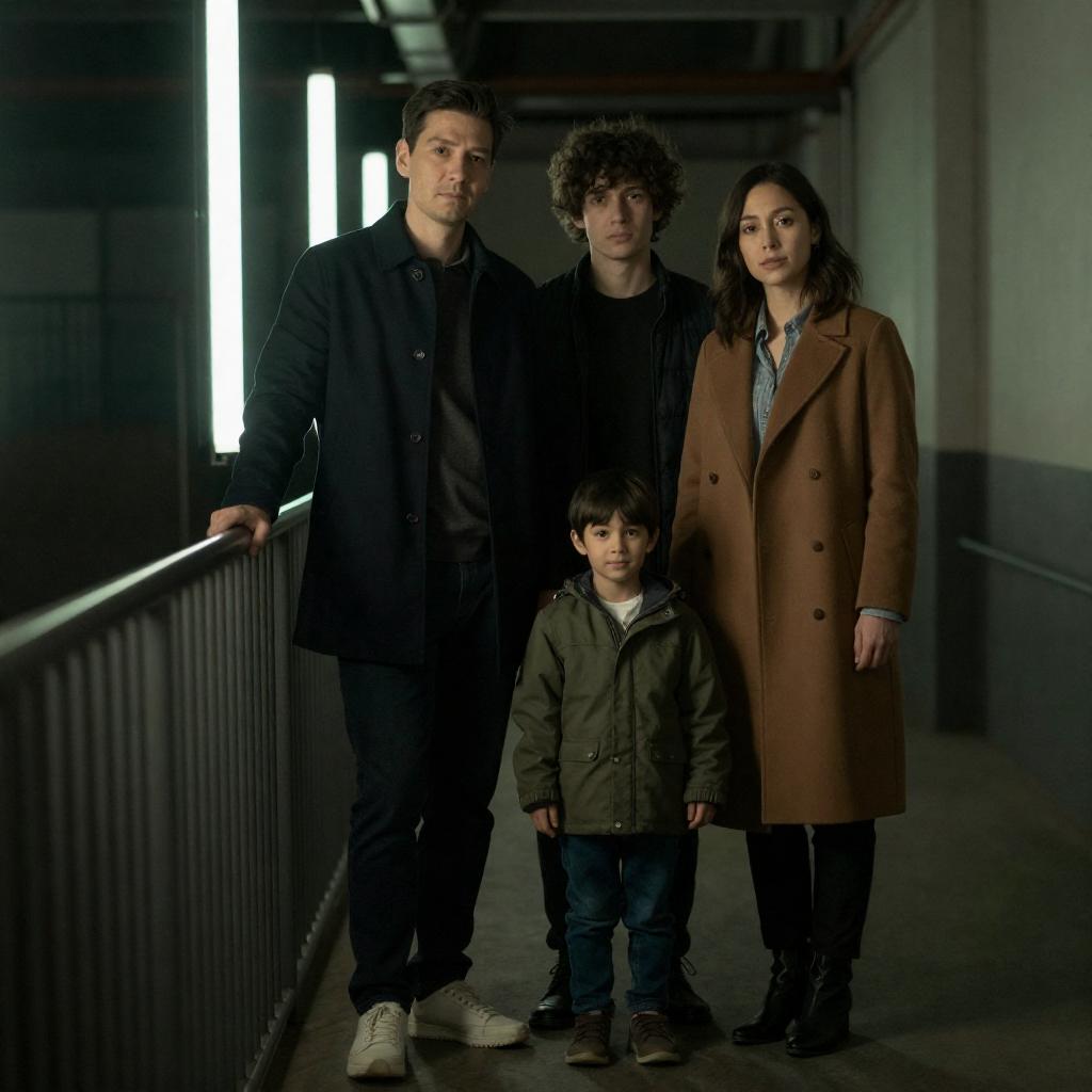 Photograph of a family standing in a dimly lit, industrial hallway with green-tinted light bars on the left. The family consists of four people: a tall man in a dark coat, a shorter man with curly hair, a woman in a brown coat, and a young child in a green jacket. They stand closely together, with the man on the left leaning against the railing and the others slightly huddled. The background is dark and shadowy, emphasizing the green light.