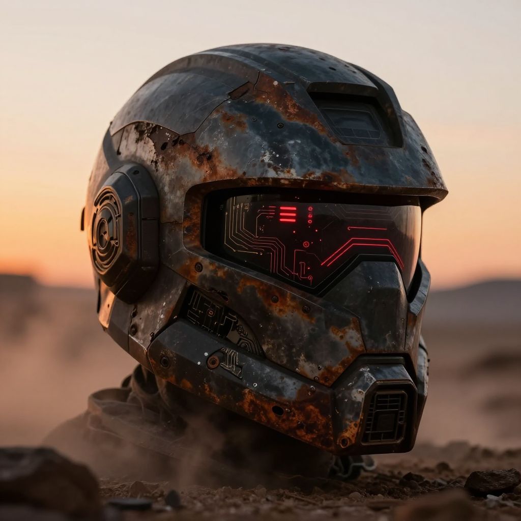 Power armor helmet, futuristic sci-fi design with sleek metallic surfaces, glowing blue visor, intricate mechanical details, worn and battle-scarred, sitting on a dark industrial table with sparks flying around, high contrast lighting.