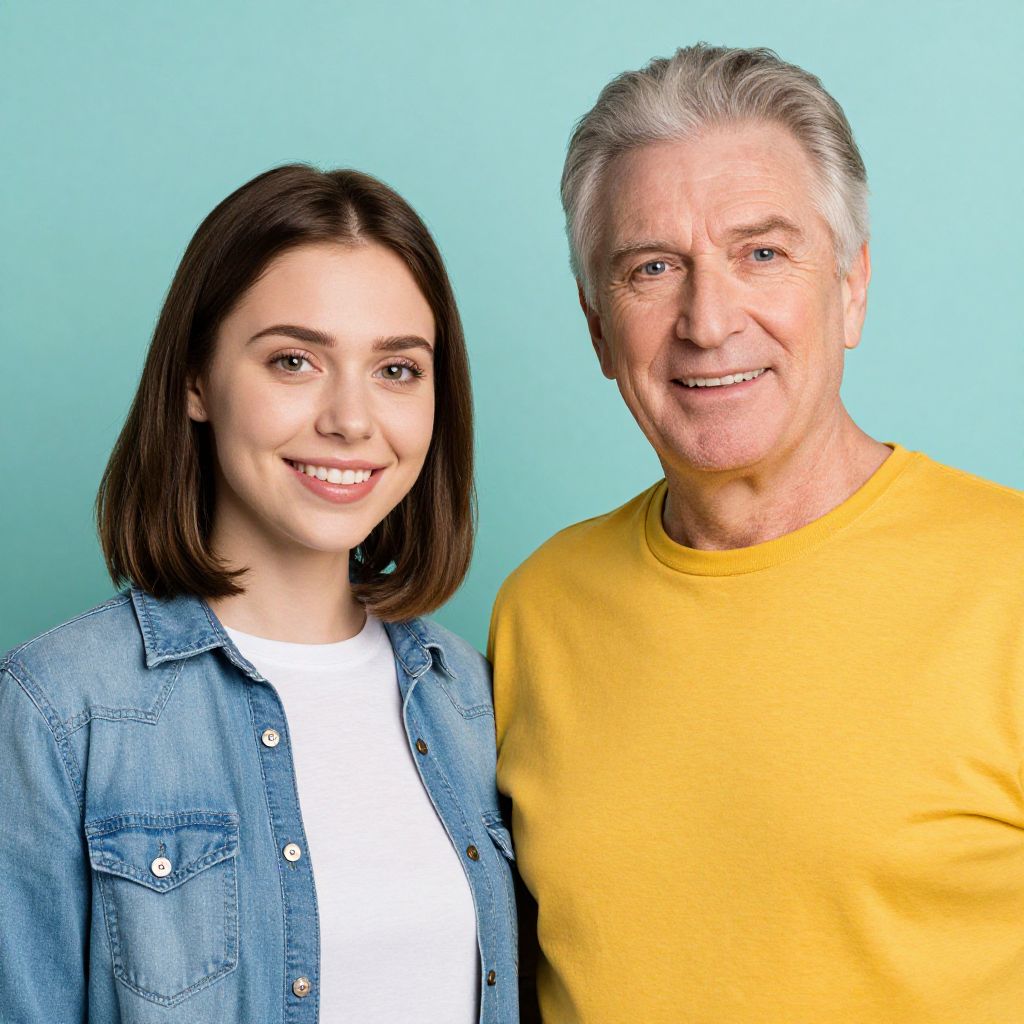Two individuals, a younger woman with brown hair and a denim jacket and an older man with gray hair and a yellow shirt, stand together against a soft teal background, exuding warmth and companionship.