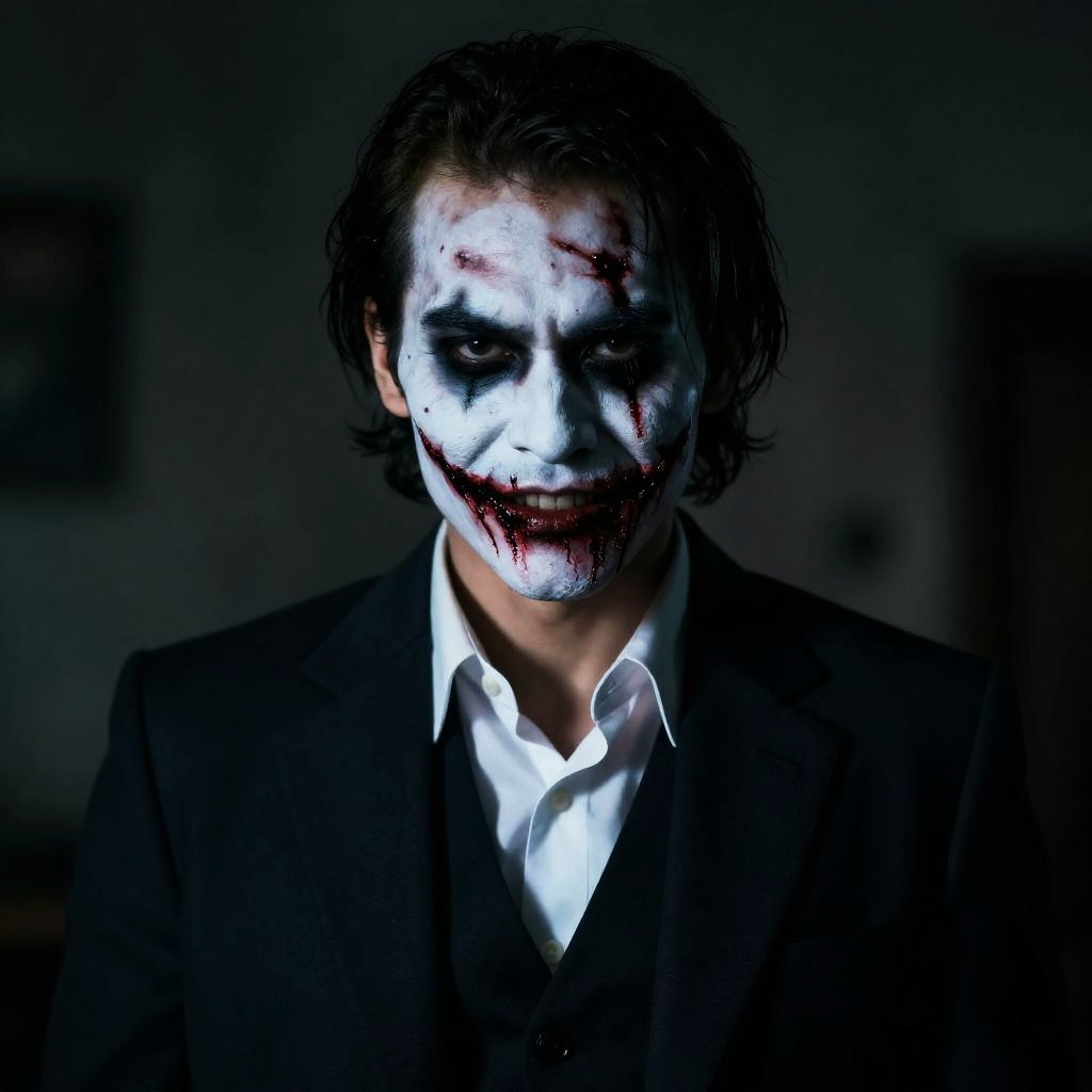 Zombie man crouching in snow, dirty black suit, white face paint, blood on face, intense expression, flames in background, two shadowy figures standing behind.