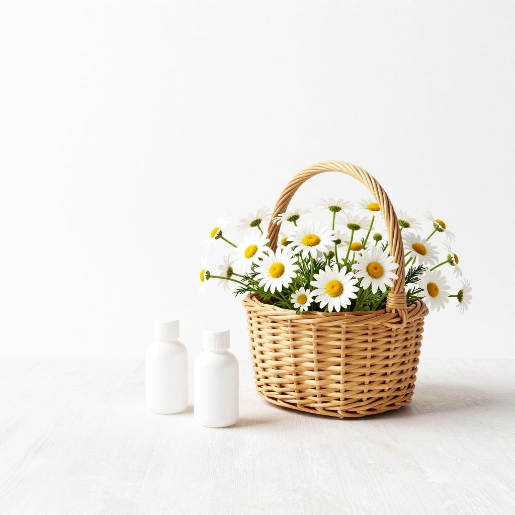 A super clean toon-shaded 3D render featuring a rounded pastel lilac porcelain pot holding a delicate stem of white baby's breath sprigs, on a seamless white background with three small empty white bottles nearby; high contrast, bold accent colors, thin clean lines, balanced composition, generous negative space, soft studio lighting, modern minimalist aesthetic, crisp edges, no text, no watermark